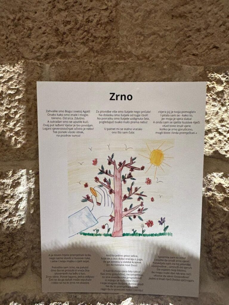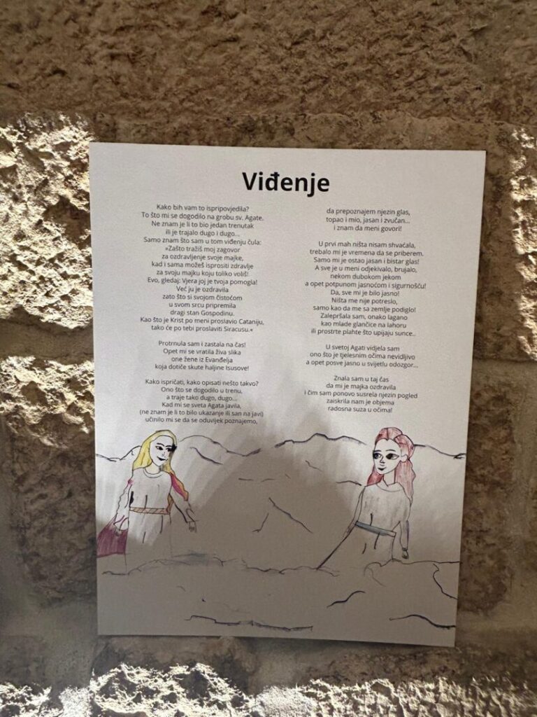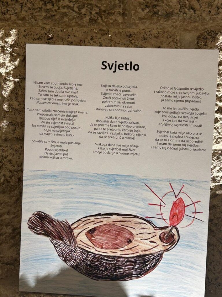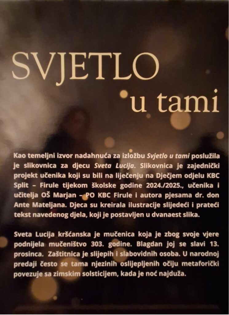 Večer prije blagdana svete Lucije, u kripti splitske katedrale sv. Duje otvorena je izložba „Svjetlo u tami“, nastala prema slikovnici za djecu „Sveta Lucija“. Ova izložba nije samo umjetnički događaj, nego i priča o zajedništvu, vjeri i snazi kreativnosti.